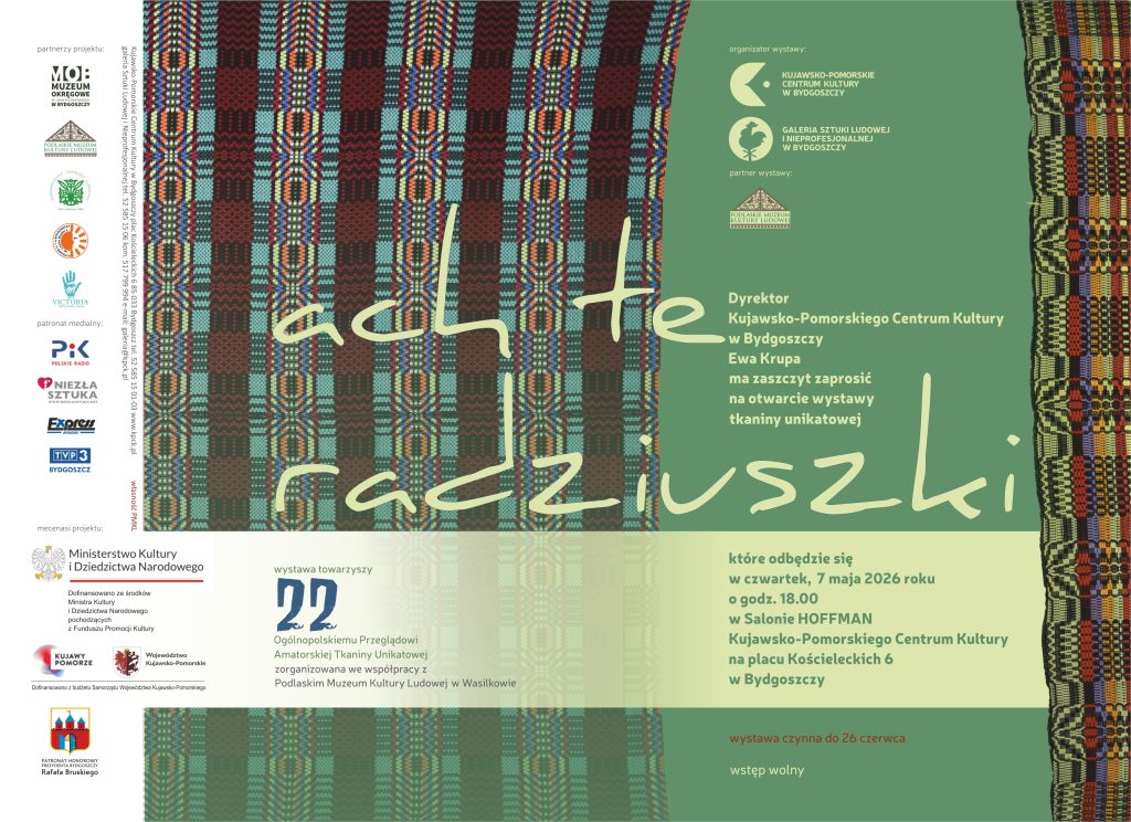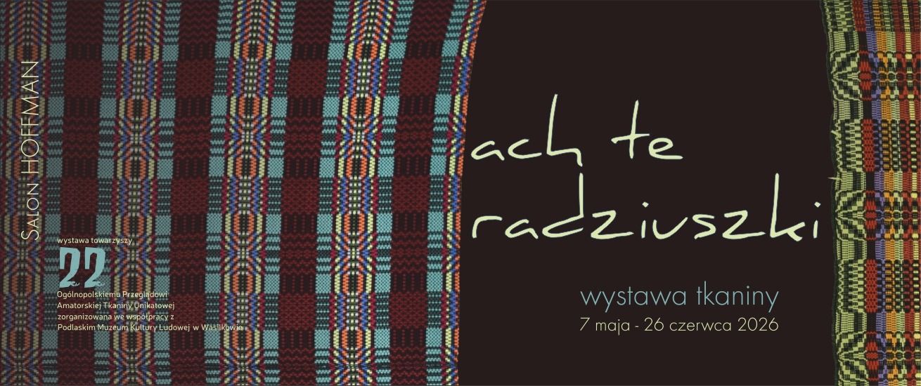 „Ach, te Radziuszki” – wystawa towarzysząca XXII Ogólnopolskiemu Przeglądowi Amatorskiej Tkaniny Unikatowej, jest kolejną z wystaw prezentujących unikalne techniki tkackie i bogate w tej materii, polskie dziedzictwo. Radziuszka, tkanina wileńska, płachta, dziaruga lub dywan to wszystko nazwy ludowych tkanin przetykanych, które z pogranicza litewsko-białoruskiego, rozeszły się na Kurpie, Podlasie czy Lubelszczyznę. Ich tradycja sięga końca XIX w. Na tle utworzonym splotem płóciennym powstaje wzór poprzez przewlekanie dodatkowego wątku z wełny lub bawełny w kolorze odmiennym od tła. Obok motywów geometrycznych, gwiazdek, meandrów, zygzaków, zdarzają się motywy roślinne, zoomorficzne, nawet antropomorficzne. Tkaniny te użytkowano głównie jako narzuty – do przykrywania łóżek, siedzeń, wozów, podłóg i stołów. Najstarsze z nich były tkane na wąskich krosnach i zszywane z dwóch części. Na wystawie zobaczymy zarówno tkaniny historyczne, często anonimowych tkaczek jak i prace współczesne. Pochodzą one ze zbiorów Podlaskiego Muzeum Kultury Ludowej w Wasilkowie.