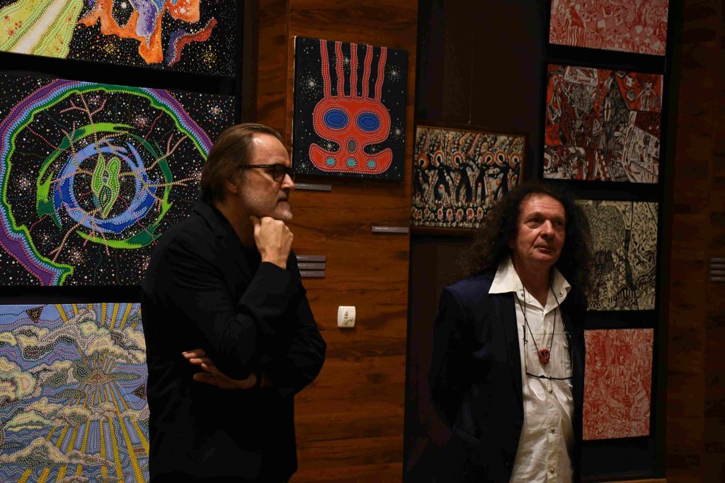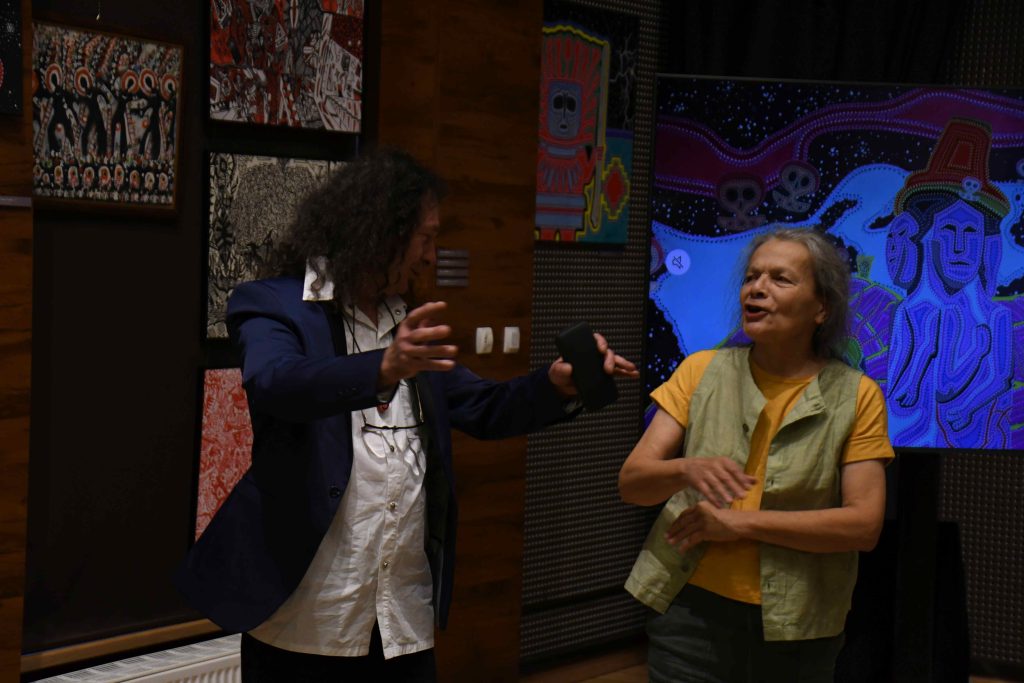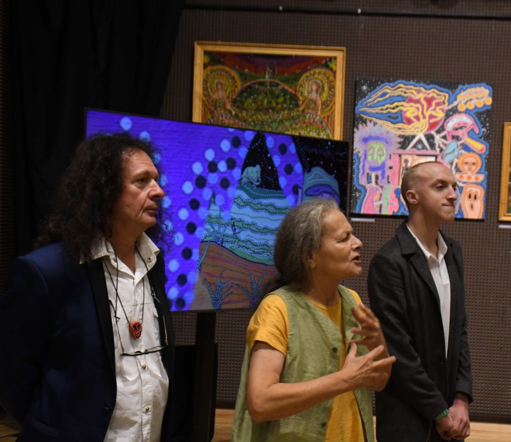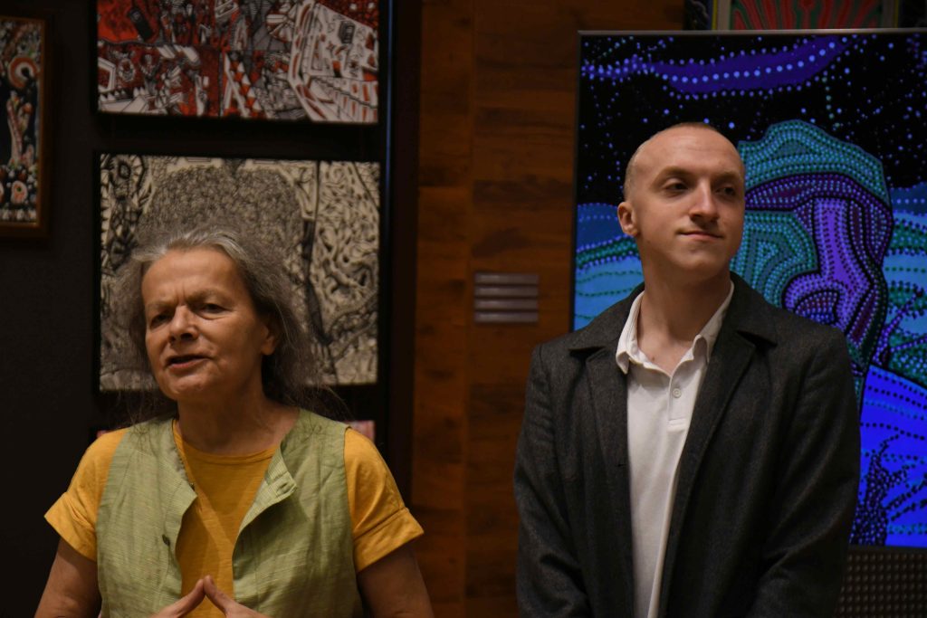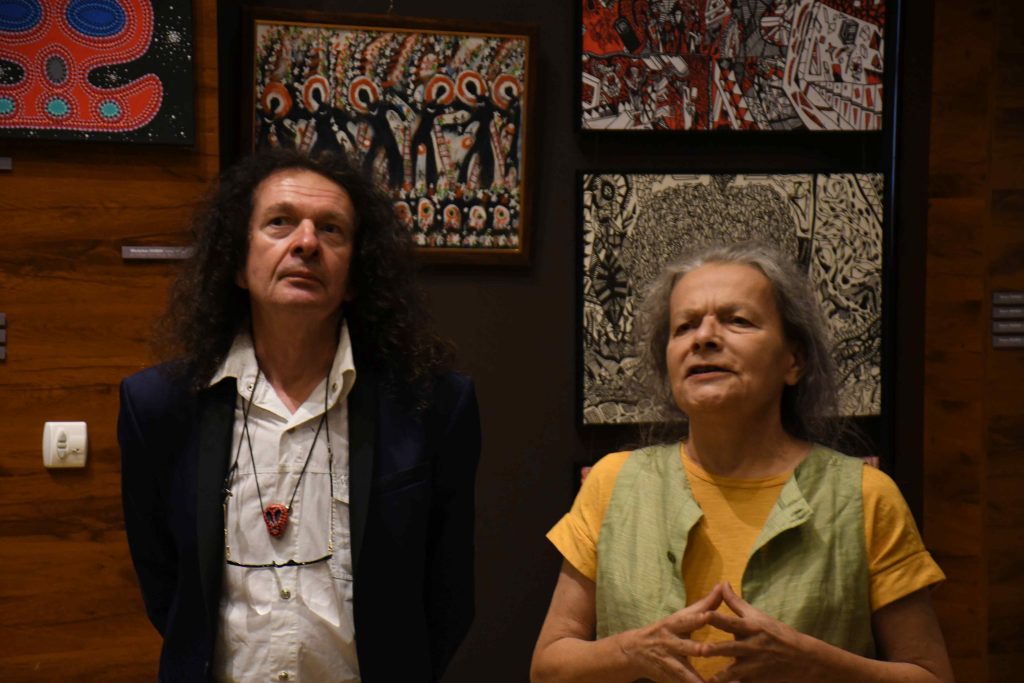Macieja Jelińskiego, szubińskiego twórcę i animatora kultury, prywatnie naszego przyjaciela, od zawsze interesował kosmos w pełnym wymiarze – od źdźbła trawy po galaktyki – i nasze człowiecze w nim miejsce. Inspirują go zdjęcia odległych gwiazd, galaktyk, mgławic, które dzięki teleskopom i osiągnięciom astrografii możemy dziś podziwiać. W niebo spoglądaliśmy zawsze z ciekawością i lękiem. We wszystkich starożytnych kulturach mity kosmologiczne stanowią bardzo ważną ich część, są próbą odpowiedzi na pytanie kim jesteśmy wobec otaczającej nas nieskończoności. Twórczość Macieja podejmuje próbę malarskiego przełożenia starożytnych mitów na współczesny język obrazowania. Wykorzystuje tu sztukę Aborygenów, w której obraz rozbity na punkty, zbudowany z „pikseli” łączy archaiczne symbole z formalnymi dokonaniami współczesnego malarstwa, tworząc zrozumiały dla dzisiejszego odbiorcy przekaz.