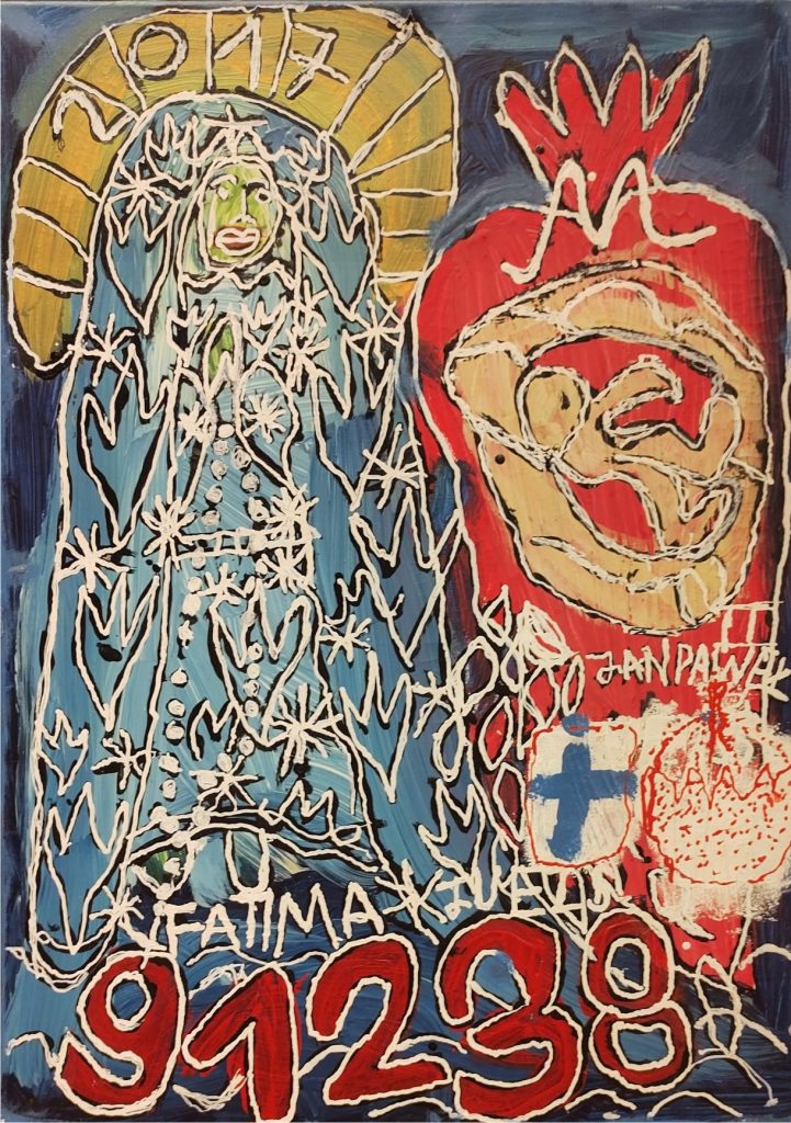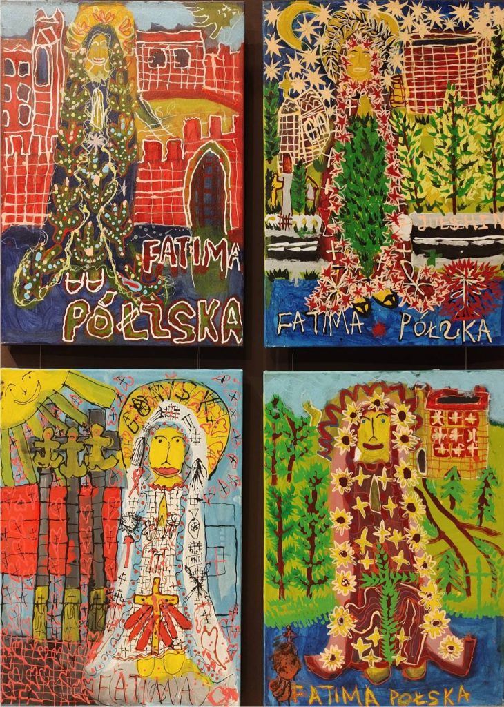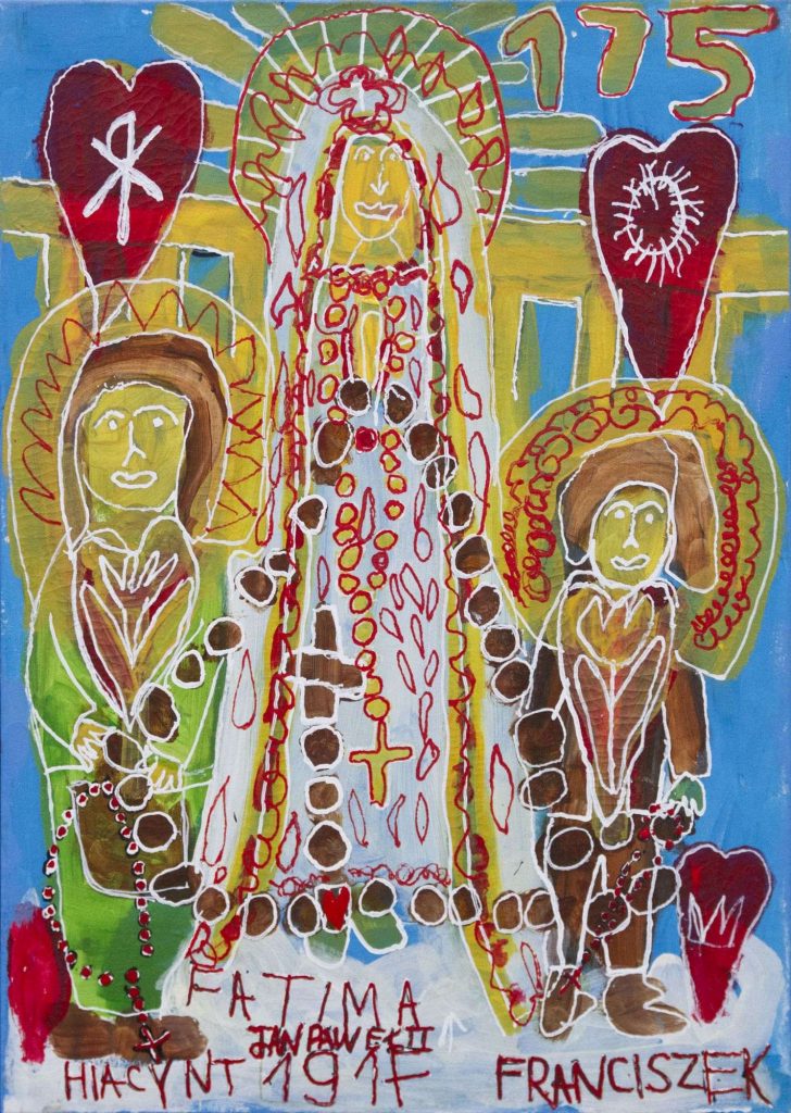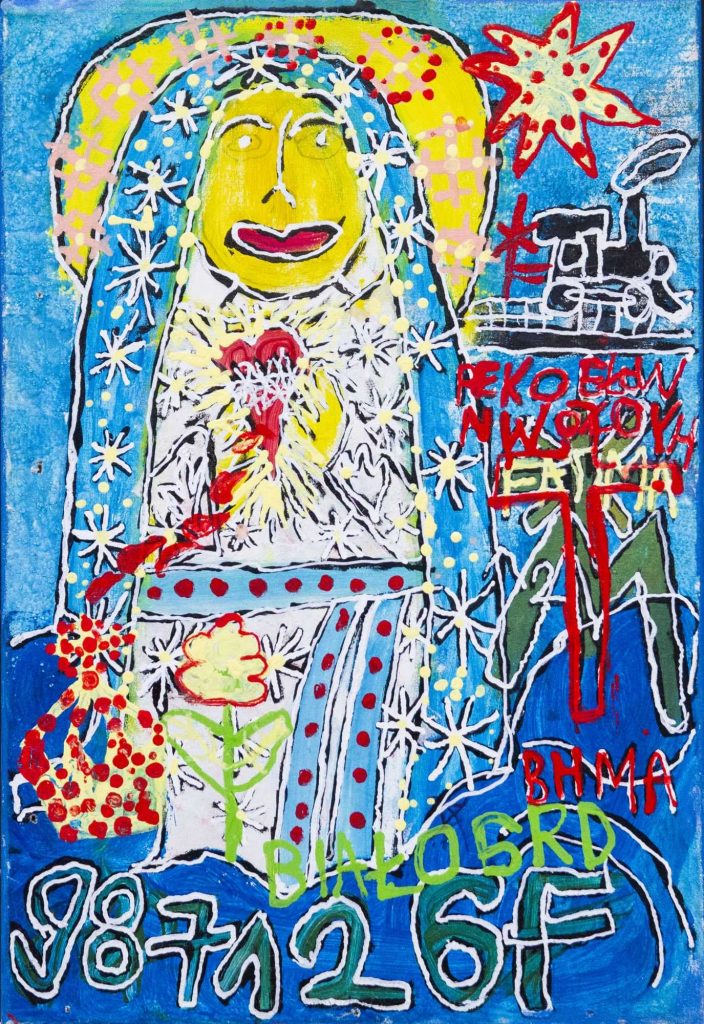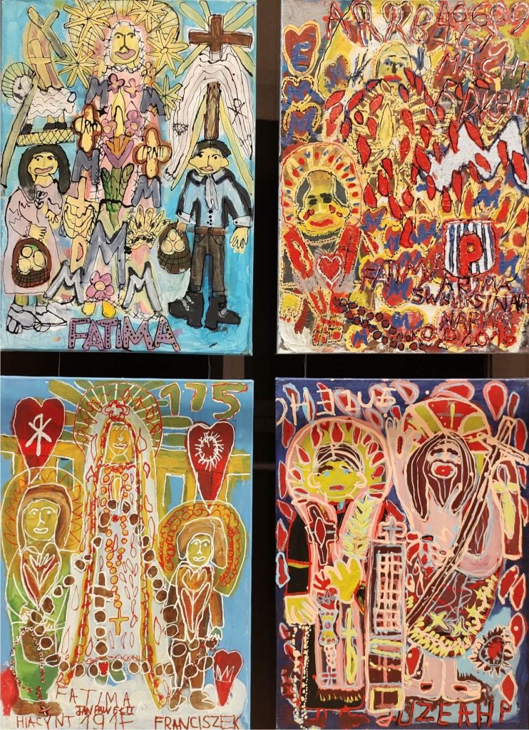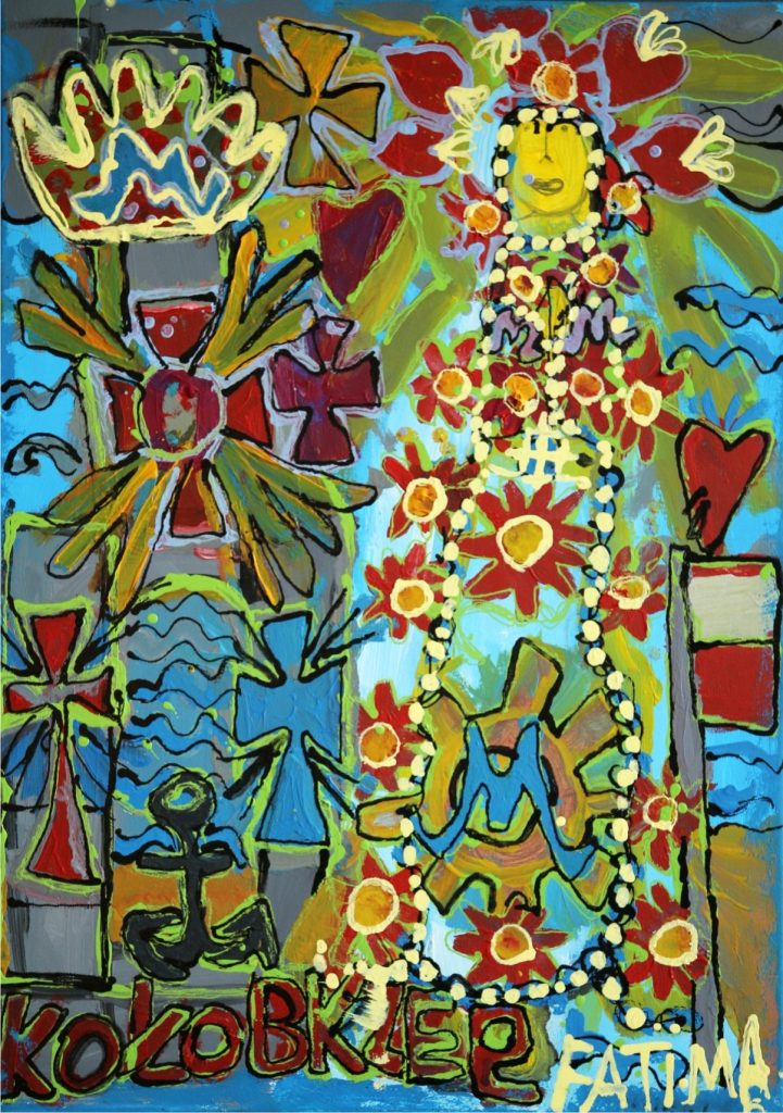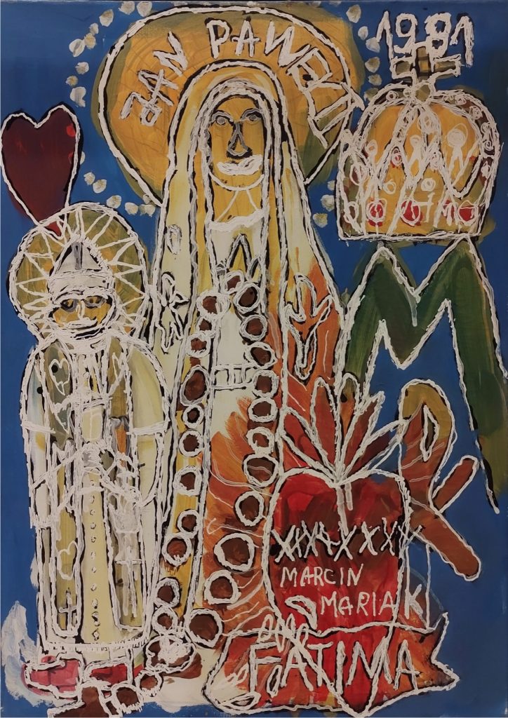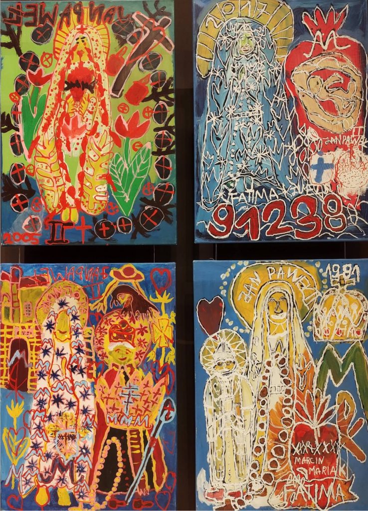 Świat Marcina jest głęboko religijny. Zaczynał od miedzianego drutu, który w jego rękach zamieniał się w korony Matki Boskiej. Sztandary własnoręcznie projektowane i wyszywane przywodzą na myśl dzieła Hasiora. W malarstwie akrylowym na płótnie w dalszym ciągu głównym tematem jest religia. Cykl „ Matka Boska w odsłonach” mimo podobnej kompozycji, posiada ogromne walory kolorystyczne. Horror vacui – czyli tendencja zapełniania całej powierzchni obrazu, bez pustego tła, tak charakterystyczna dla sztuki Celtów, Indian , czy Islamu jest dla niego naturalna, zakodowana.