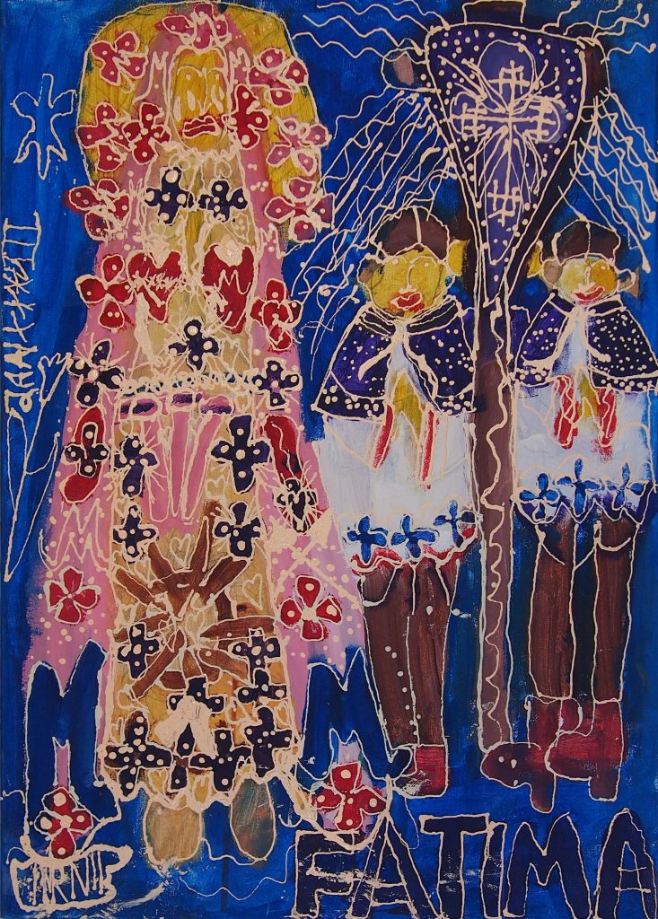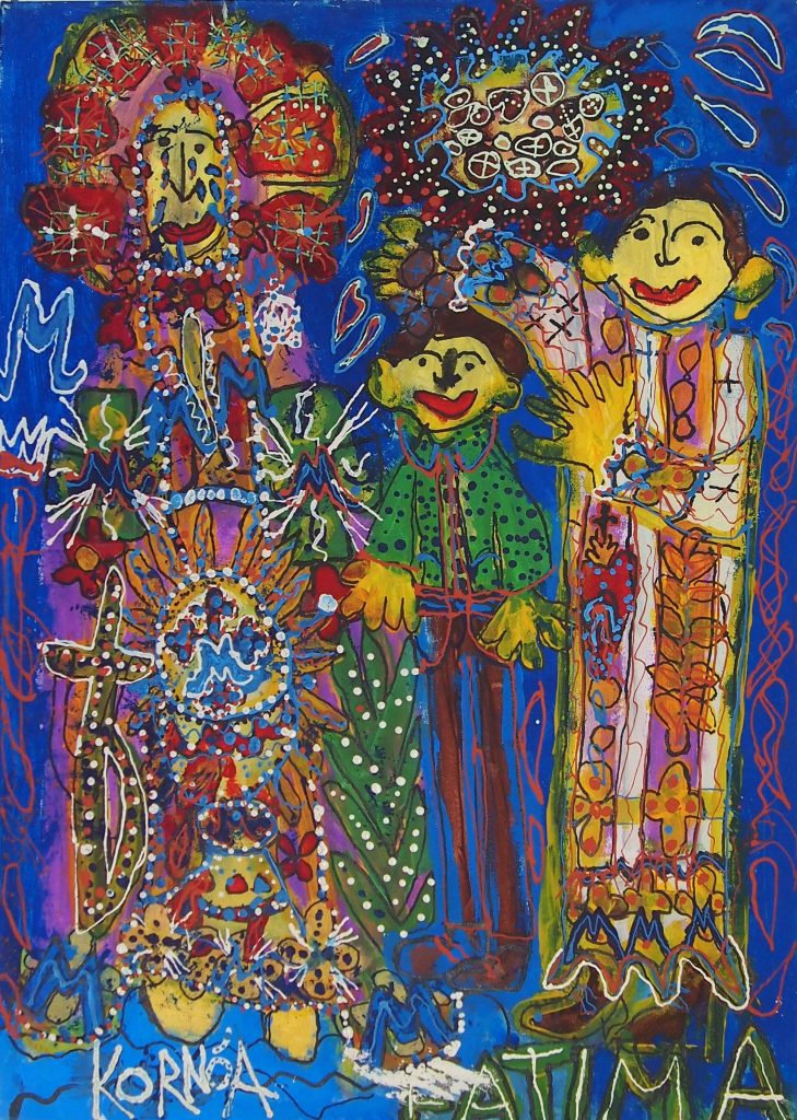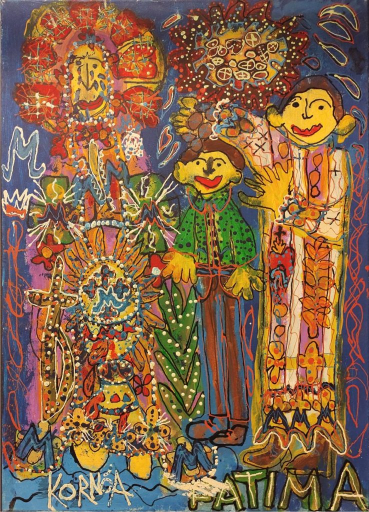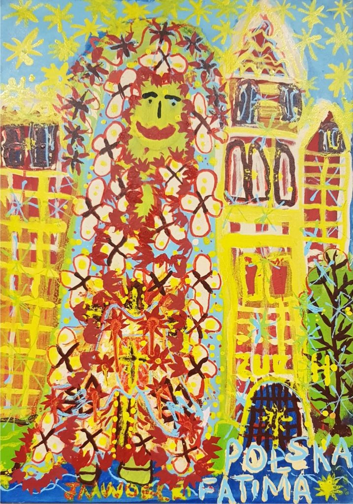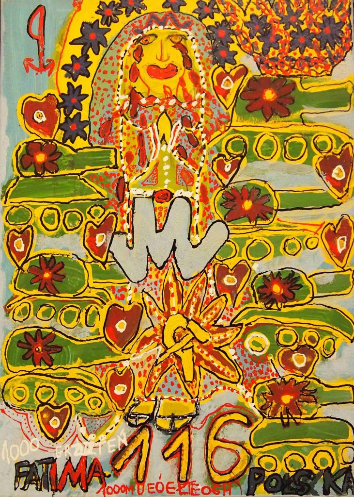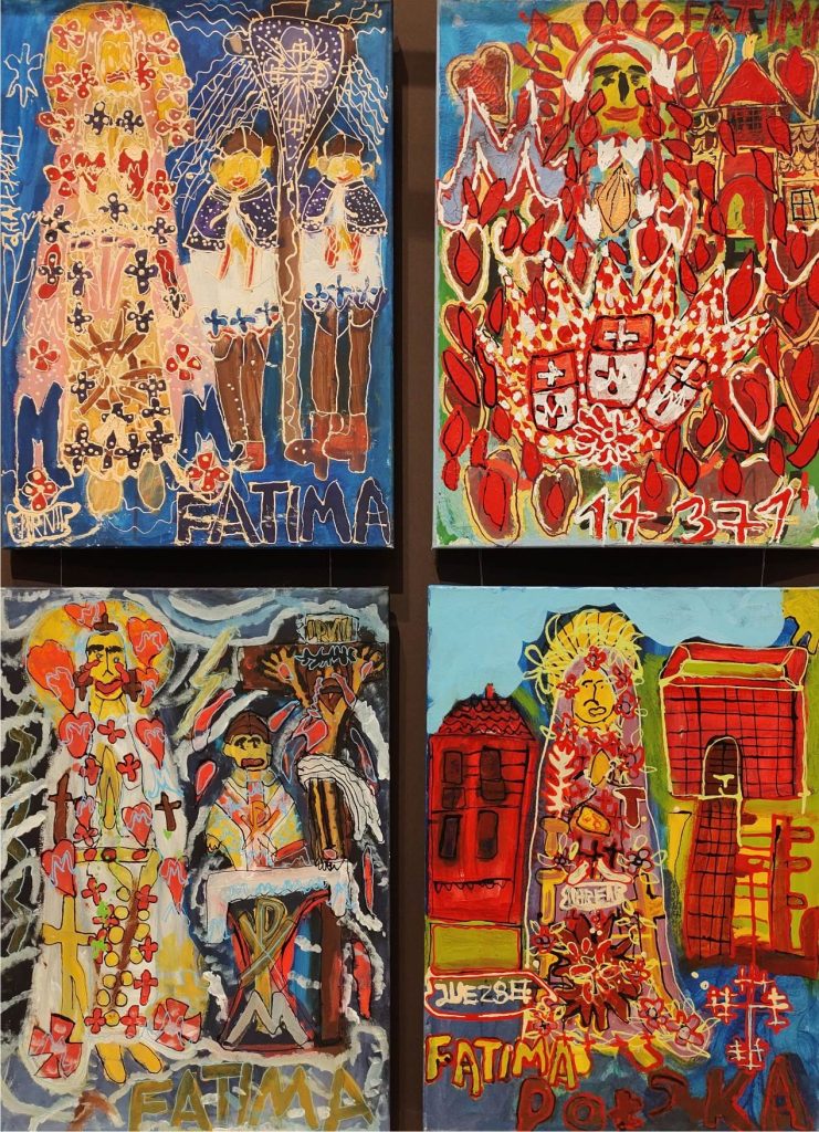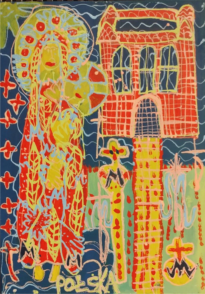 Świat Marcina jest głęboko religijny. Zaczynał od miedzianego drutu, który w jego rękach zamieniał się w korony Matki Boskiej. Sztandary własnoręcznie projektowane i wyszywane przywodzą na myśl dzieła Hasiora. W malarstwie akrylowym na płótnie w dalszym ciągu głównym tematem jest religia. Cykl „ Matka Boska w odsłonach” mimo podobnej kompozycji, posiada ogromne walory kolorystyczne. Horror vacui – czyli tendencja zapełniania całej powierzchni obrazu, bez pustego tła, tak charakterystyczna dla sztuki Celtów, Indian , czy Islamu jest dla niego naturalna, zakodowana.