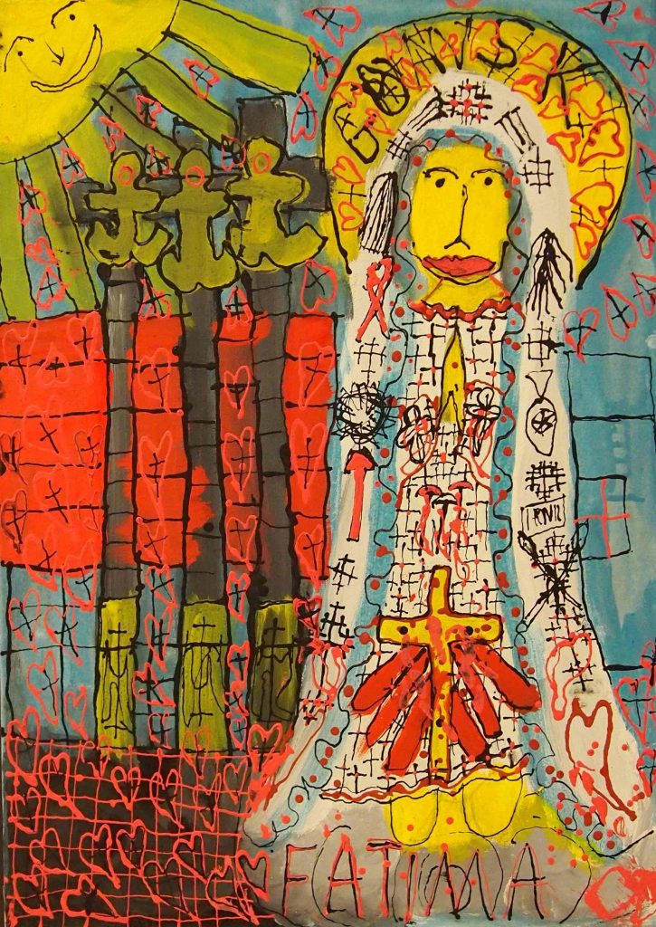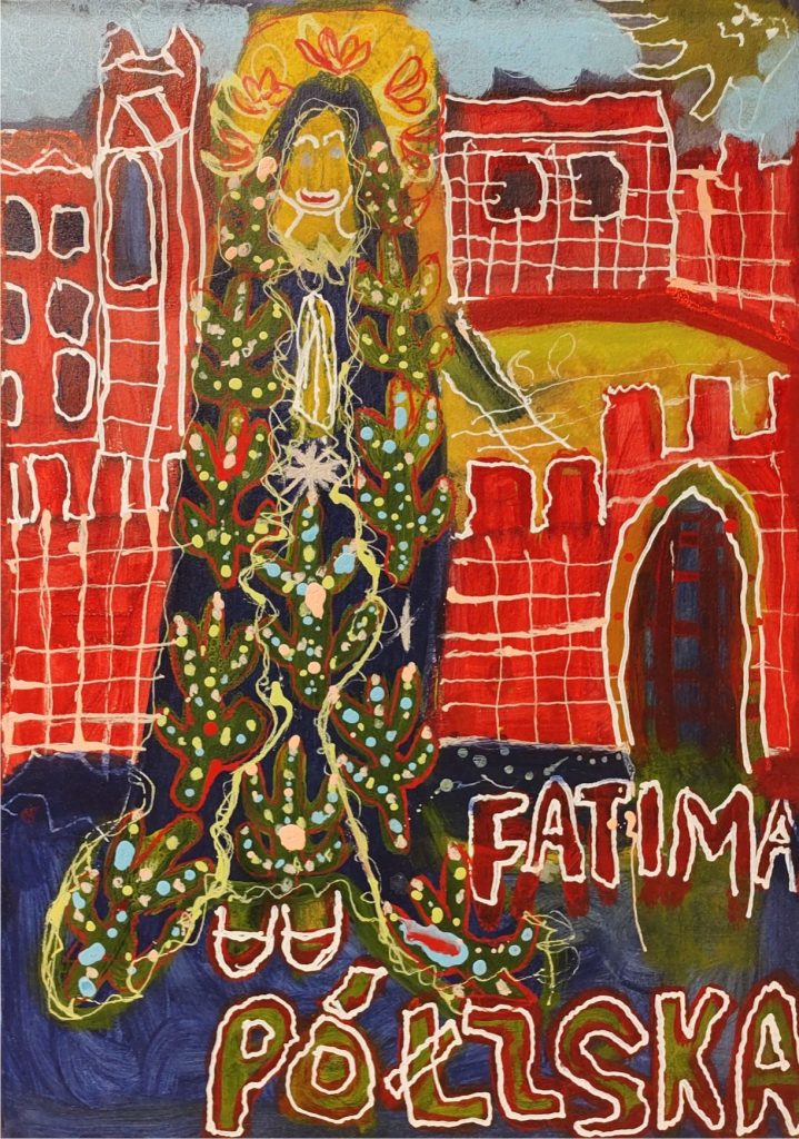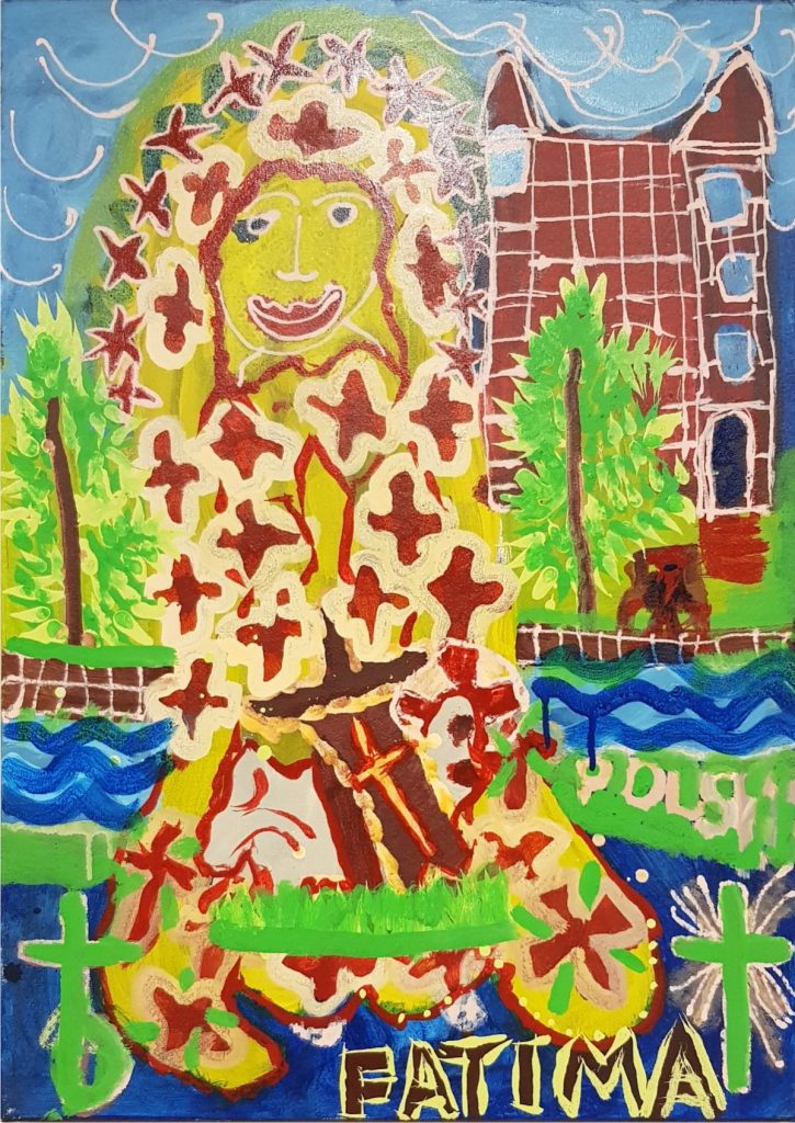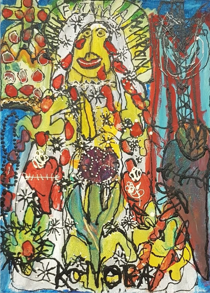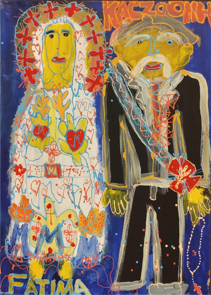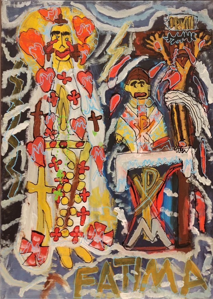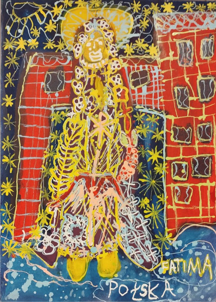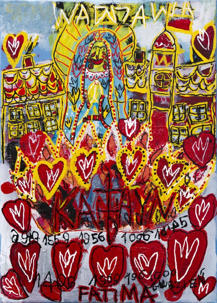 Świat Marcina jest głęboko religijny. Zaczynał od miedzianego drutu, który w jego rękach zamieniał się w korony Matki Boskiej. Sztandary własnoręcznie projektowane i wyszywane przywodzą na myśl dzieła Hasiora. W malarstwie akrylowym na płótnie w dalszym ciągu głównym tematem jest religia. Cykl „ Matka Boska w odsłonach” mimo podobnej kompozycji, posiada ogromne walory kolorystyczne. Horror vacui – czyli tendencja zapełniania całej powierzchni obrazu, bez pustego tła, tak charakterystyczna dla sztuki Celtów, Indian , czy Islamu jest dla niego naturalna, zakodowana.