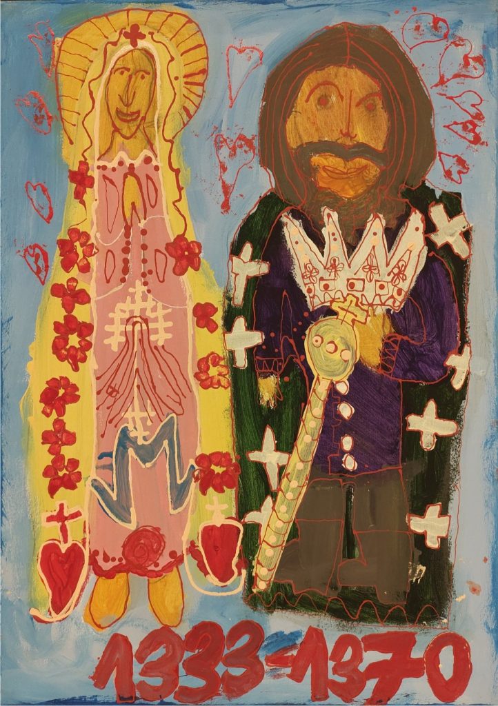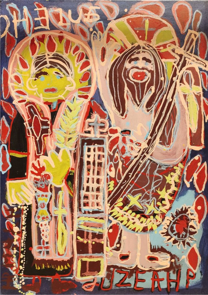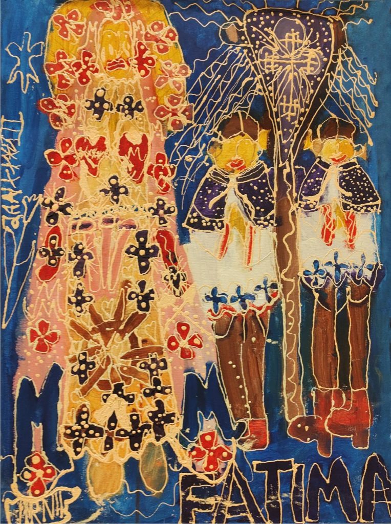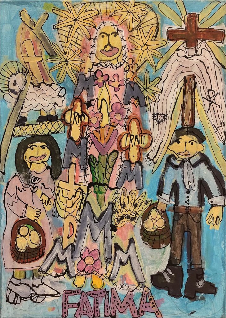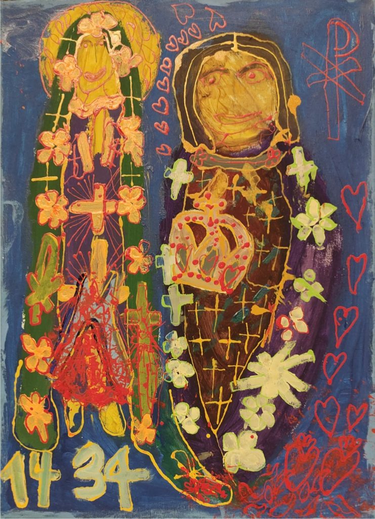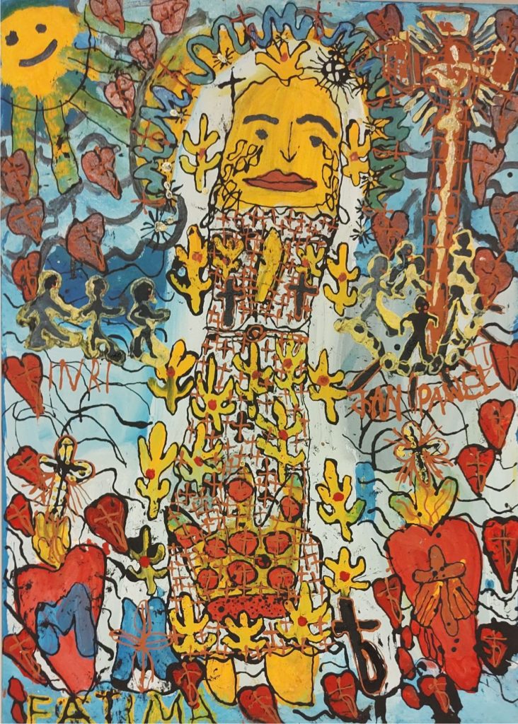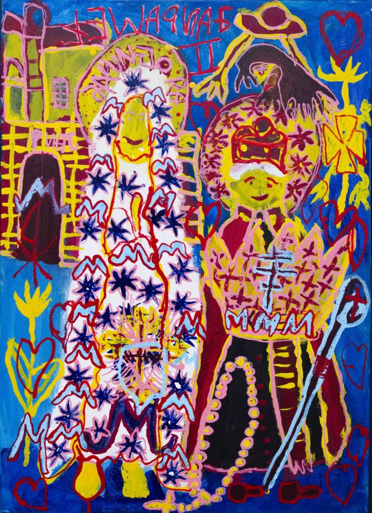 Świat Marcina jest głęboko religijny. Zaczynał od miedzianego drutu, który w jego rękach zamieniał się w korony Matki Boskiej. Sztandary własnoręcznie projektowane i wyszywane przywodzą na myśl dzieła Hasiora. W malarstwie akrylowym na płótnie w dalszym ciągu głównym tematem jest religia. Cykl „ Matka Boska w odsłonach” mimo podobnej kompozycji, posiada ogromne walory kolorystyczne. Horror vacui – czyli tendencja zapełniania całej powierzchni obrazu, bez pustego tła, tak charakterystyczna dla sztuki Celtów, Indian , czy Islamu jest dla niego naturalna, zakodowana.